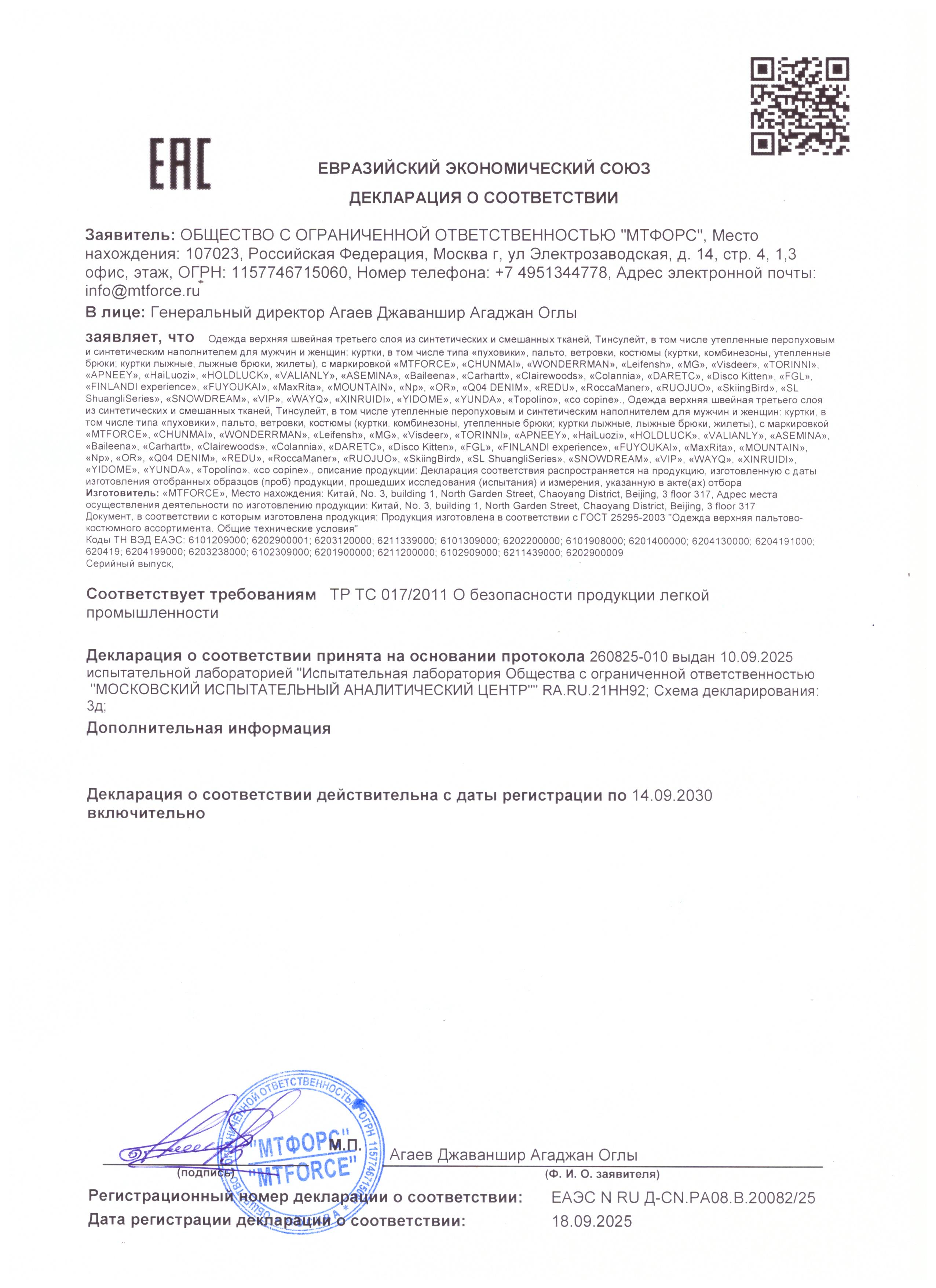 Компания MTFORCE занимается оптовой продажей верхней одежды собственного производства. Товар сертифицирован (сертификат соответствия ЕАС №1157746715060), и соответствует техническим регламентам Таможенного союза. В этом разделе представлен полный пакет документов, с которым могут ознакомиться все покупатели.