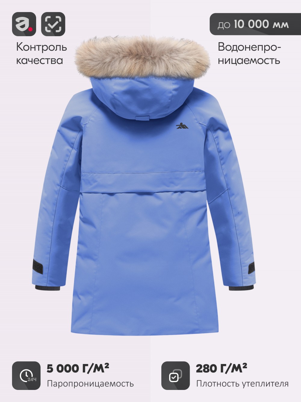 Капюшон с меховой отделкой надёжно защищает от ветра и снега, а фиксаторы на рукавах, по линии талии, на капюшоне и по низу парки помогают сохранить тепло и защитить ребёнка от продувания.